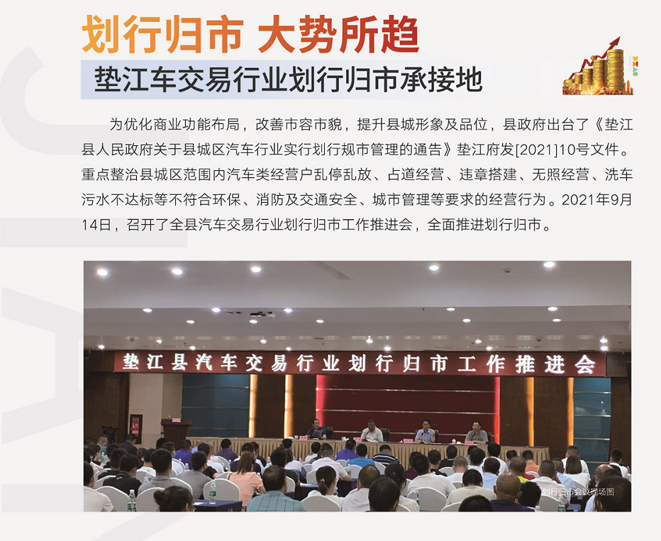 墊江國際汽貿(mào)城作為政府劃行歸市指定的唯一汽貿(mào)汽摩配交易集散市場,順應(yīng)城市需要,為升級城市商業(yè)而來!政府規(guī)劃將車管所整體搬遷進(jìn)駐汽貿(mào)城,全面實(shí)施劃行歸市,提升城市形象,打造汽車產(chǎn)業(yè)之城;開發(fā)商自持大量物業(yè)與商戶共同發(fā)展,運(yùn)營前置,招商先行。